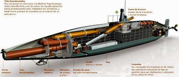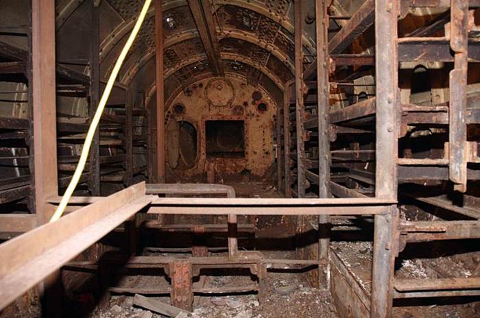 Sección central. Al fondo una escotilla de acceso al compartimeinto de proa y que recuerda a las de submarinos muy posteriores. Los estantes servían para los acumuladores eléctricos.