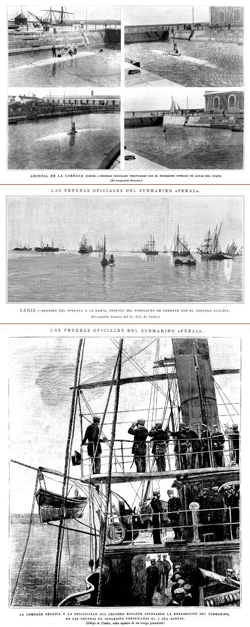 Termino por hoy con una serie de grabados de época que he encontrado sobre las pruebas del Peral en Cádiz.♦