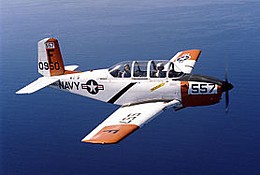 Design of the T-34 was wholly conventional. The engine was mounted to the extreme front of the fuselage, followed by the tandem-seat cockpit. The student pilot and instructor sat under a bubble canopy offering up excellent visibility in all quadrants. Wings were low-mounted monoplanes and unswept, clipped at the tips, and fitted just under the cockpit and sported some dihedral (upwards angle). The tail was equally conventional and made up of a single vertical tail fin with little to no sweep. The tail fin was complimented by a pair of horizontal planes. The aircraft sat on a tricycle undercarriage with two single-wheeled main landing gear legs retracting under each wing and a single-wheeled nose landing gear leg retracting rearwards under the engine compartment.