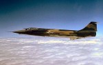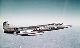 El Lockheed F-104 Starfighter, denominado el «misil con un hombre dentro», fue creado en 1952 por el equipo de diseñadores de Clarence L. (Kelly) Johnson con el objetivo de superar a cualquier caza que los soviéticos pudiesen emplear en la Guerra de Corea. La intención fue la de producir un caza pequeño y simple con gran relación empuje-peso y de máximas prestaciones en el combate aéreo. Johnson diseñó un avión de amplia cuerda y alas rectas y de corta envergadura de sólo 10’16 cm. de grosor y un borde de ataque tan afilado que requería ser tapado con fieltro protector en tierra para evitar heridas al personal de mantenimiento. Dos prototipos XF-104 (53-778617787), cada uno de ellos dotados con un turborreactor Wright XJ65-W-6 Sapphire de 3.538’1 kg. de empuje iniciaron las pruebas de vuelo en la Base Edwards (California) el 28 de febrero de 1954, con el piloto Tony Levier a los mando del primer avión en volar. Les siguieron 17 YF-104A (55-295512971) que fueron probados con el motor General Electric YJ79-GE-3 de 6.713’3 kg. con posquemador. La evaluación del Starfighter siguió adelante aunque no sin problemas, ya que el accidente de un F-104A causó la muerte del as de Corea Capitán Iven C. Kincheloe. El 29 de enero de 1958 el primero de los 153 F-104A fue entregado a la 83ª Ala de Cazas Interceptores en la Base de Hamilton (California).