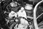 Power is supplied by two pressurized water nuclear reactors using enriched uranium fuel rods. Each reactor weighs 160 tonnes, both are contained in a closed compartment under reduced pressure. Fuel consumption is approximately 200 g. per day of heavy isotopes when breaking thick ice. 500 kg. of Uranium isotopes are contained in each reactor when fully fueled. This allows about 4 years between changes of the reactor cores. Shielding of the reactor is by steel, high density concrete and water. The chain reaction can be stopped in 0.6 seconds by full insertion of the safety rods.