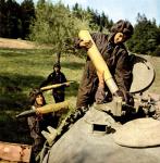 Outwardly, the T-54 was a decidedly Soviet tank design featuring a well-rounded cast steel turret emplacement mounting a 100mm. main gun. The look was not unlike that as featured on the wartime Josef Stalin series of heavy tanks fielded against the Germans. The 100mm main gun barrel was relatively featureless and not capped by a muzzle brake. The gun was ranged (with good penetrative capabilities) out to targets some 1,000 yards away, its only structural misgiving being the limited downward traverse, a noted deficiency which restricted use of the «hull down» firing tactic. Up to 34 projectiles of 100mm. ammunition could be carried and this ran the standard gamut of high-explosive and armor-piercing rounds. Ammunition was stored in the turret as well as throughout the hull. Air defense was provided for via a 12.7mm. DShK anti-aircraft heavy machine gun located at the loader’s hatch. Further defense came from a 7.62mm. SG coaxial machine gun fitted in the turret alongside the main gun armament (operated by the gunner). A rather novel design feature included machine guns fitted to the fenders for additional anti-infantry defense.