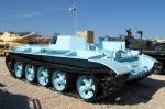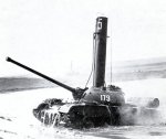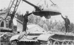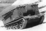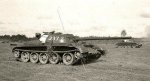 Structurally, there were five large road wheels adorning either track side with the front-most pair set noticeably ahead of the rearward set wheel pairs. The drive sprocket was fitted at the rear with the track idler at the front. No track return rollers were implemented into the track design. The hull superstructure was of a relatively low-profile while the glacis plate was well-sloped, contouring nicely into the hull roof. Crew accommodations consisted of the driver, tank commander, driver and main gun loader (the bow-mounted machine gunner/radio operator crewman common to most World War 2 tanks had fallen out of favor by this point). The driver maintained a front-left position in the front hull while the commander, gunner and loader were situated in the turret with the former group at left and the latter at right. The engine was fitted to the rear of the hull and consisted of a single V-54 series 12-cylinder water-cooled diesel engine developing 520 hp. Construction of the hull was of an all-welded design and overall weight fell just under 40 short tons at 39,700 kg.