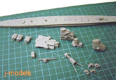 I started building the different sections: first the hull and later several areas of the superstructure such as turrets, bridge, funnels, catapult, etc. The canvas protection of guns are made of putty.