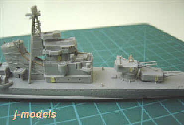 Las puertas del puente y torres las hice cortando y limando restos de fotograbado. Las escalerillas de las torres fueron un trabajo difícil, y tras pintar el barco no quedaron demasiado vistosas, pero al menos lo intenté. Las barandillas son todas de Aber. Al hidroavión de reconocimiento Aichi E13A le añadí la hélice, el mástil y la antena (hilo de cobre).