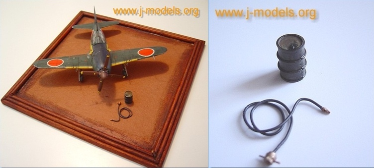 La peana es una simple tabla cuadrada a la que he añadido un marco encolado y tintado. La escena no tiene mayores pretensiones: los elementos principales son el modelo, el bidón y la pequeña manguera. En el espacio que queda delante del avión, irán algunas marcas de rodamiento en el suelo, que sugieren que un vehículo ha llevado el bidón allí. En esta base he intentado mantener los elementos que la integran al mínimo posible con lo que deseaba expresar.El bidón y la manguera fueron realizados y pintados antes que el terreno. La manguera es un cable de cobre de un grosor adecuado, la boca es una pequeña lámina también de cobre enrollada y el extremo que ajustaría en el camión de combustible lo hice con plástico y cobre. Los extremos llevan color dorado de Humbrol. El bidón, procedente de otra maqueta, está pintado con Humbrol 66 gris mate algo aclarado. Luego lo decoré con óleos a pincel seco de colores rojizos para imitar óxido y lavados de Humbrol 93 arena. Los bordes se detallan con una mina de grafito. El derrame que chorrea por la superficie se barnizó en brillante tras pintarlo de negro.