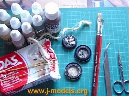 Tools and materials to build the scene. Vallejo acrylic paint, white glue, modelling paste, some string and sawdust, tiny stones and beach sand (salt can be a good alternative). I used a number 10 flat brush for base colours and a number 6 for details. The former is enough for bigger scales.
