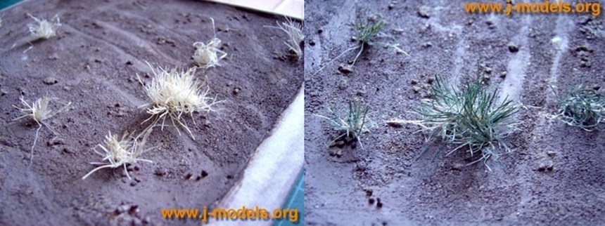 A continuación se añade la vegetación. Para una base sencilla no hay que complicarse la vida. Basta unos sencillos «matorrales» de cuerda de pita pegados con cola y luego cortados a diferente medida. La vegetación en general tiene tendencia a tener tonos de verde más oscuro por la parte inferior que por la superior. Algunas pequeñas ramas comienzan a secarse por el extremo. Usé un pincel plano del número 6 con la misma técnica que en el suelo. Primero la capa base de verde oscuro de Vallejo 920, tratando de cubrir al máximo las hebras, luego maticé la zona media de las plantas con verde claro de camuflaje 833 y por último añadí en la punta de algunas ramas el ocre amarillo. De nuevo, hay que hacerlo con variedad. Algunas plantas aparecen más secas (o verdes) que otras.