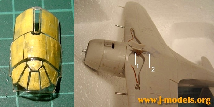 Tras pegar las alas y los alerones traseros, y antes de detallar los pozos del tren de aterrizaje, abrimos el pequeño compartimiento donde se alojaban los servos de apertura con un cutter afilado (1). Posteriormente pegamos las compuertas y les añadimos el mecanismo de cierre con hilo de cobre. Hay que tapar con masilla los agujeros donde va colocado el depósito auxiliar de combustible, que no voy a usar (2). Decidí eliminar los cañones del kit y hacerlos con aguja hipodérmica cortada con el minitaladro. Antes de pintar, sólo queda enmascarar el transparente que pinté aparte. También enmascaré el motor y la carlinga. El secreto de esta operación está en cortar tiras pequeñas y no demasiado anchas para adaptarlas a la superficie redondeada.