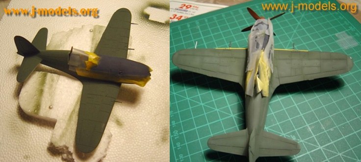 Top surfaces were painted in Tamiya XF-11 IJN Green mixed with some drops of XF-2 flat white airbrushed in two thin layers too. After that, I painted the cowling in a mixture of XF-1 flat black (60%) and XF-8 flat blue (40%). The first green shade was whitened with a little more white paint. I airbrushed this color in the middle of panels in oder to get contrast by means of adding more light. I also painted the typical yellow line in the leading edges adding a little drop of orange (mixture of Tamiya red and yellow) to flat yellow XF-3.