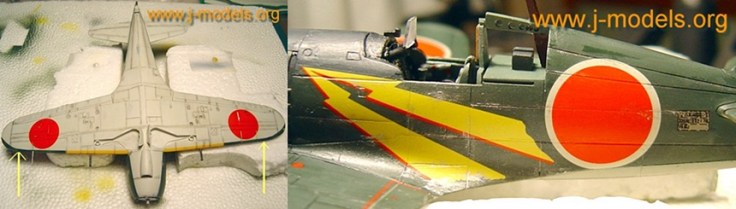 A la izquierda, un detalle importante del aparato del Teniente Aoki en la zona inferior: el color verde superior continúa bajo los bordes de ataque y tiene el mismo ancho de las bandas amarillas. Posteriormente barnicé todo el modelo con barniz brillante de Humbrol y coloqué las calcas. Tras un nuevo barnizado en brillante, comencé el proceso de envejecido del modelo por la zona inferior. Usé pasteles para imitar los derrames de los depósitos y la suciedad en las líneas de paneles. La característica más personal del aparato de Aoki eran los rayos pintados a ambos lados del fuselaje. El grado de desgaste de la maqueta es cuestión de referencia histórica y de gusto del modelista. El punto exacto es difícil de saber. En este caso he preferido representar un avión aún no demasiado desgastado por el uso.
