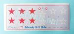 La hoja de calcas lleva impresas estrellas soviéticas de dos tipos, un juego de numerales y algunos estarcidos. Las calcas tienen aspecto mate y no muy fino. La saturación de color es buena, pero el soporte excesivo y necesita ser recortado.