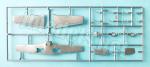 The wings consist of three pieces. The lower piece fits into the upper ones with the tips and control surfaces molded on these. The panels are sparse and again feature very thin raised lines. The ailerons, flaps, and fins are very well defined and the structure is rendered in thin lines. The landing lights on the leading edges come in two small clear pieces. The wingtip lights are too prominent and narrow. The lower wing piece includes a ventral fuselage section showing the exhausts with hollowed tailpipes and no defined outlets on the fuselage surface. The kit includes a bomb under the left wing and what seems to be an auxiliary tank on the right, but both pieces can be discarded, as they were not normally used.