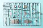 The tow tractor’s body is broken down into four basic elements, comprising a base, the upper part without the separate hood, the front, and the rear sides. The upper part is molded with the seats provided with separate backrests and the pedals. Behind the seats are a bulkhead, the license plate, a tail light, and the tow hook, all in separate parts.