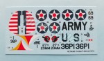 La hoja de calcas, aunque más bien pequeña, tiene buena calidad. Los motivos son finos y los colores aparecen muy bien impresos. Además de las escarapelas y marcas del timón del ejército norteamericano, hay numerales de distinto tipo y color, insignias de unidad y marcas para el morro de la versión de entrenamiento.