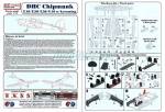 Las instrucciones, comunes para todas las versiones de este Chipmunk como he señalado, muestran una breve referencia histórica sobre el avión en checo e inglés, un plano de localización de piezas en los bastidores (cuyas piezas no están numeradas), 14 secuencias de ensamblaje muy claras y una hoja de perfiles para colocar las calcas. La cara trasera de la caja lleva impresos varios perfiles más a color para las tres versiones de este T.30. Todas ellas muestran la presencia de una antena en la parte posterior del fuselaje de la que no hay rastro en las instrucciones. Las referencias de pintura son de la gama esmalte de Humbrol.