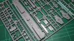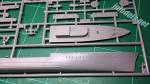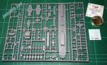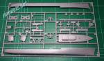 The hull comes in two well moulded, thin halves showing portholes along the sides. There are no aligment pins as usual with Mirage. In the hull we find a part for the rudder and two for the propeller axles. Aligment of these must be careful as they are not parallel as the instructions correctly show. The propellers are separate parts with thick blades which need refining.