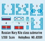 Differently from other HB sub kits, there are no optional PE parts for the propellers or other small details. The fret only includes four parts to build the stand with only one of them sporting the Kilo Class label. The decal sheet is fine, colours are in register and saturated without too much carrier film. Both national and navy flags for Russia and China are included.