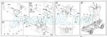 El eje delantero es de una pieza detallado con una fina barra estabilizadora, las bieletas y algunas pequeñas piezas más. Tras su instalación, hay que pegar los frenos de tambor. El eje trasero sólo cuenta con los frenos y la parte interna de la llanta.