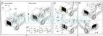 The nose of the vehicle contains a front, two side pieces and the hood divided in halves that can be shown open. The sides show well-profiled and clean engine louvres. The front face has a photo-etched grille and the headlights. The standard headlight is provided with a separate clear lense but there is an alternative blackout headlamp. Assembly choices include one of each type or one of the two headlights on the left and a gap on the right covered by a round photo-etched piece for the vehicle number plate, which is later detailed with a decal showing a black number on yellow backgound. The inner grill face has two frames to fit the radiator.