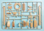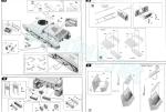 Two box-shaped elements with pyramidal tops and engine ducts (air filters?) are attached on the rear fenders as well as a spare box with separate latches, the jack, some photo-etched clamps, and the tools (pick and shovel). The tool clamps can be replaced with photo-etched parts. The exhausts are supplied in halves, as is the hollowed exhaust pipe. The photo-etched muffler covers are folded using the thick plastic section on sprue A, as mentioned above.