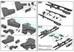 - Folleto de 12 páginas de tamaño A4 impreso en papel satinado. Contiene plano numerado de piezas, tabla de colores con equivalencias en pinturas de Vallejo, 24 capítulos de montaje y perfiles. Bien impresas y claras.