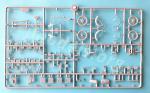 As in any other vehicle with one, assembly begins with the engine. The block is divided in four pieces with the cylinders separated and broken up in halves. The block includes the dynamo-magnet and the starter on the front, with a separate starter pedal. The carburettor with feed ducts to the two cylinders are also separate parts. The cable joining the magneto and the cylinders is not be glued until a later step when you attach the exhaust pipes.