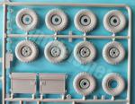 The wheels are made of plastic and divided into halves. Although they can’t compete with resin counterparts, they look good on the rims, but Italeri fitted them with six nuts instead of the standard five, a very noticeable detail at first glance. The tires are only detailed with the tread pattern on the shoulders. The sidewalls have the manufacturer’s information and name in raised detail. The spare wheel is the same, but without the outer rim. Each wheel is inserted into the axles, which have the hubcaps provided with a separate disc.