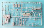 La caja trae cuatro bastidores de piezas, un bastidor transparente, las calcas y las instrucciones. Aunque las piezas están por lo general bien producidas y limpias, al molde se le conocen los años por la gran cantidad de marcas de eyector en muchas piezas. Una observación detenida nos hace ver el vaso medio lleno porque no son grandes ni profundas ni tampoco todas evidentes, por eso creo que el esfuerzo de eliminarlas no se dilatará hasta el aburrimiento.