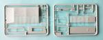 It consists of four pieces showing some rough texture simulating fabric. The roof has a thin, well-defined frame edge. The sides have recesses for the windows, which are not used in this kit, and on the outside there is a small, closed fabric window. The back side has a sharp window frame and some raised cords. The clear panel is thick, like the rest of pieces of this kind in the kit.