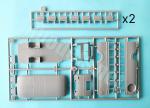 El chasis está completo en una pieza sin marcas. La parte delantera está detallada con el paragolpes más los ganchos de remolque y la matrícula. El último travesaño lleva el enganche posterior aparte. Además de esto hay que añadir el depósito de combustible, formado por dos mitades con grandes marcas en los lados de unión y un rechupe en la parte superior.