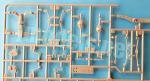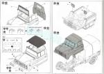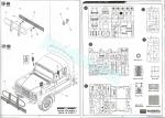 La maqueta comprende cuatro bastidores de piezas, el suelo de la cabina, el toldo y la caja trasera moldeados por separado, un bastidor transparente, una hoja de máscaras adhesivas, una plancha de fotograbados, cinco neumáticos de vinilo más ocho rodamientos de plástico, la hoja de calcas y tres manuales de instrucciones. El total de piezas de plástico de esta maqueta, descontando la figura, no llega a 150, lo que parece bastante ajustado a la escasa complejidad de un vehículo ligero como este.