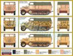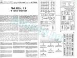 - 10-page A5 folded brochure printed in black and white. Contains a short historical reference about the half-track, a numbered parts plan, 8 assembly chapters and 3 pages of profiles. Color references are given in the RAL code and Model Master acrylic paint range. The back side of the box shows profiles for 3 of the versions with the same color references.