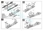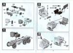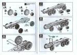 El montaje continúa con la adición del tubo de escape, moldeado con el silenciador, la suspensión trasera, que contiene las ballestas, los amortiguadores y, curiosamente, el extremo de los ejes traseros ya que estos se han separado en tres partes, con los palieres y diferenciales separados. El eje delantero, sin embargo, es de una pieza con el diferencial y tiene la barra estabilizadora aparte. Hay también un travesaño entre los ejes traseros.