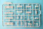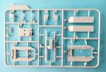 El chasis es bastante simple y contiene una pieza intermedia entre los dos largueros que nos facilita mucho el montaje de la estructura. La pieza muestra la parte inferior del motor y la caja de cambios en la zona delantera. La cara superior, que viene tapada, nos servirá posteriormente para montar tanto la cabina como la plataforma del armamento. Los largueros van pegados a los lados de la pieza recién descrita. Estas piezas poseen un detalle bastante nítido en sus caras externas y contienen las ballestas y los amortiguadores delanteros representados con definición y limpieza. En un momento posterior añadiremos las cajas de respeto y el depósito de combustible. El depósito está detallado con cinchas y el tubo de llenado, mientras que el resto de piezas tiene un detalle suficiente para la escala.