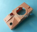El casco viene en una sola pieza fabricada sin las diferentes escotillas y accesos ni el suelo. El interior está vacío, salvo la parte posterior de las ametralladoras laterales. Los huecos corresponden al anillo de la torre, la puerta posterior de acceso, la escotilla del conductor, dos accesos al motor en la cara frontal, así como otras escotillas laterales y los afustes de las ametralladoras. Estas piezas vienen todas aparte. Las uniones de las planchas y el remachado me parecen bastante buenos y dejan patente que el fabricante ha cargado el detalle en el exterior, ya que dentro del casco no hay nada.