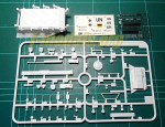 Las piezas vienen repartidas en tres bastidores principales realizados en plástico blanco para facilitar la pintura del vehículo de la ONU que se incluye como opción. También encontramos dos pequeños bastidores con piezas de vinilo y otro algo mayor con las piezas de fotograbado, destinadas a realzar algunos detalles menores y los dientes de las ruedas tractoras. Dos tiras de cadenas de vinilo, las calcas y las instrucciones completan el contenido de la maqueta. El plástico en general muestra buena calidad, sin rebabas ni marcas en lugares visibles, y el detalle es especialmente bueno en las piezas pequeñas. El tamaño del vehículo puede engañar al modelista sobre su facilidad de montaje. En realidad estamos ante una maqueta delicada, multimedia y con multitud de piezas pequeñas que no auguran un montaje con los ojos cerrados precisamente, de ahí que la haya calificado como no ideal para principiantes en el sumario.